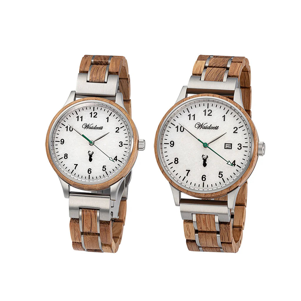 Partnerské dřevěné hodinky Waidzeit s názvem „Štajerský panter“ svým klasickým designem odrážejí nejen zelené srdce Rakouska, ale jsou také v souladu s přírodou. Elegantní bílý ciferník vyrobený z mramoru Sölker dodává těmto hodinkám velmi zvláštní a stylový vzhled.